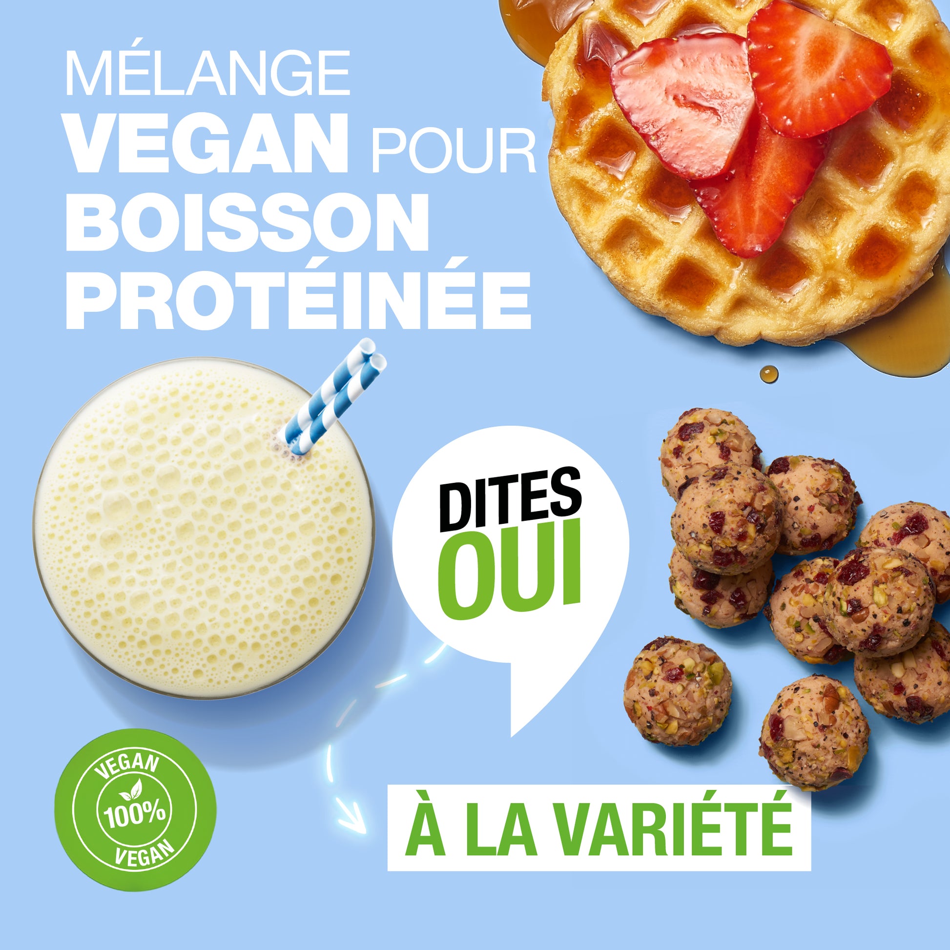 Il y a tellement de façons d'apprécier le goût délicieux du Mélange Vegan pour Boisson Protéinée. C'est le partenaire idéal pour vos shakes de Formula 1 et sa subtile saveur vanille en fait l’ingrédient parfait pour l’intégrer à vos recettes équilibre.*