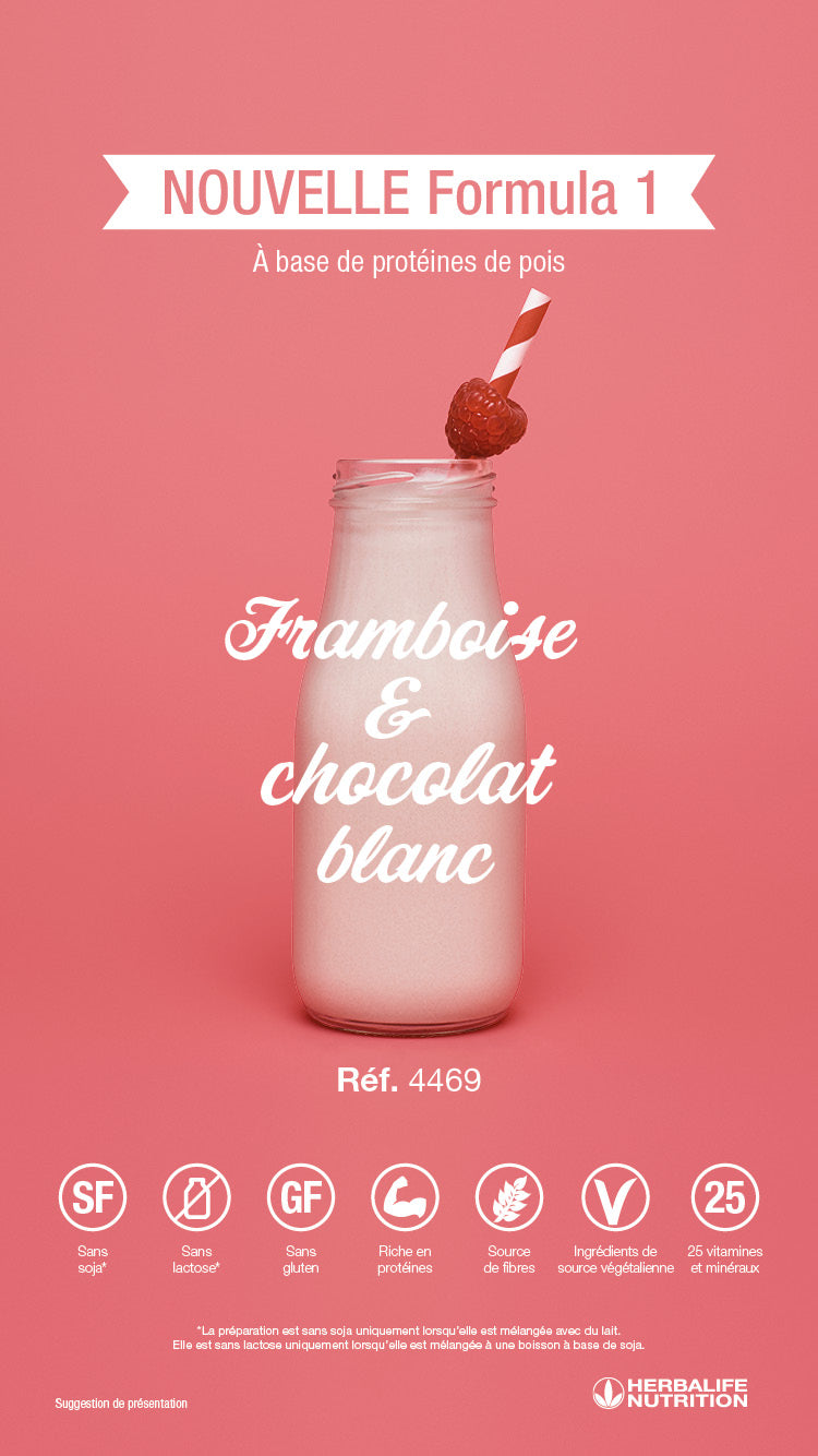 Formula 1 sans soja, sans lactose, sans gluten saveur framboise & chocolat blanc qui allie le goût, l’équilibre nutritionnel et la facilité de préparation, le tout dans un seul Shake. Elle est formulée à partir de protéines de pois et ne contient ni soja, ni lactose, ni gluten**.